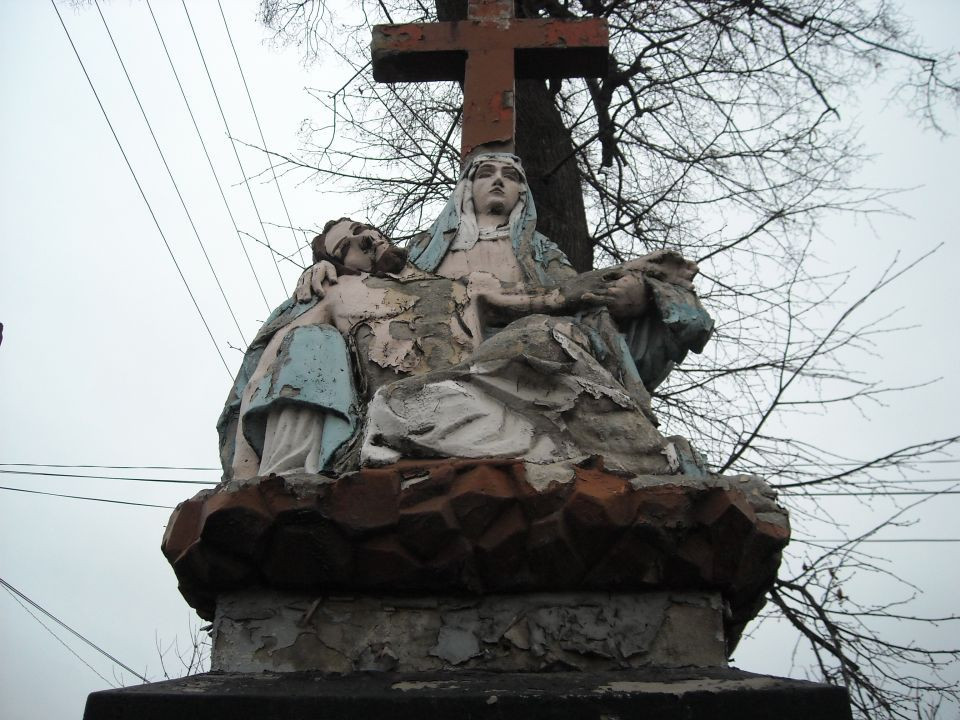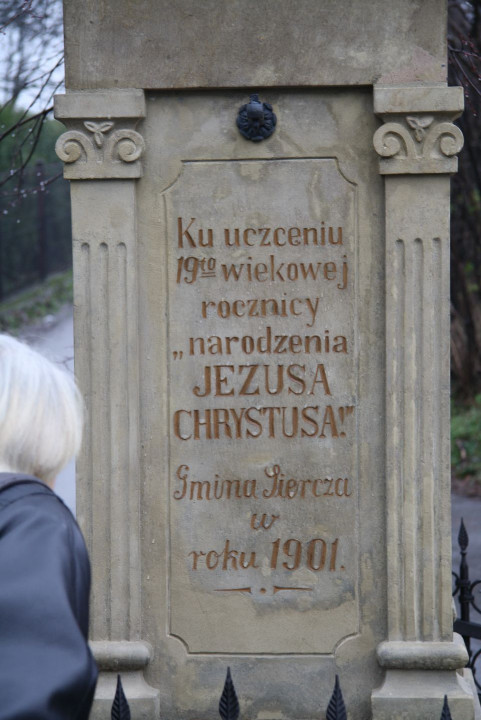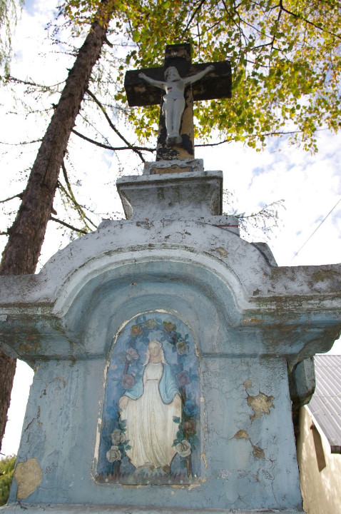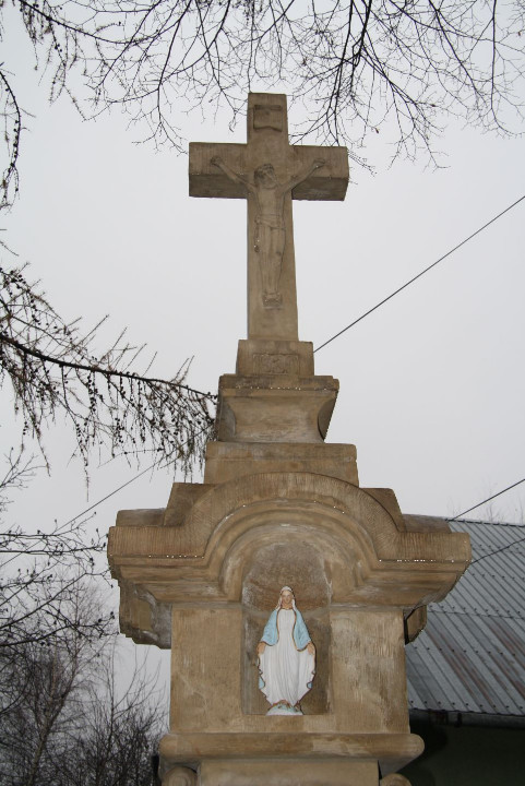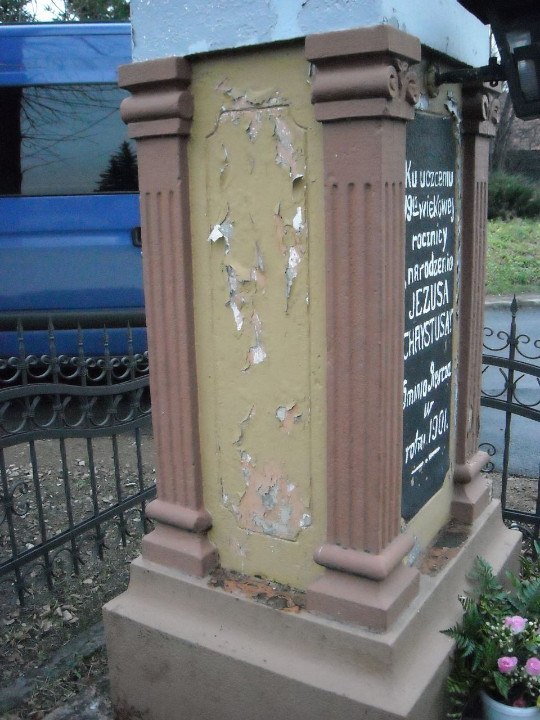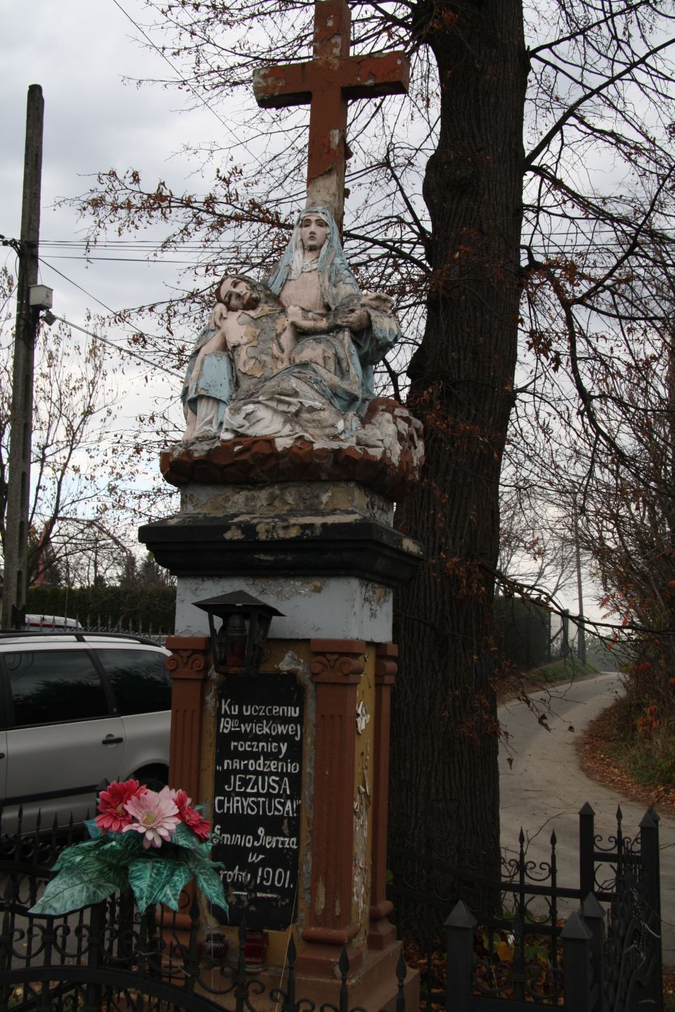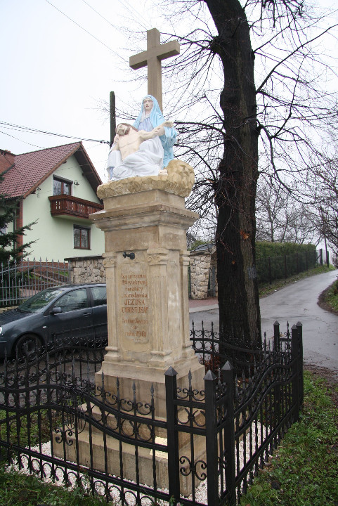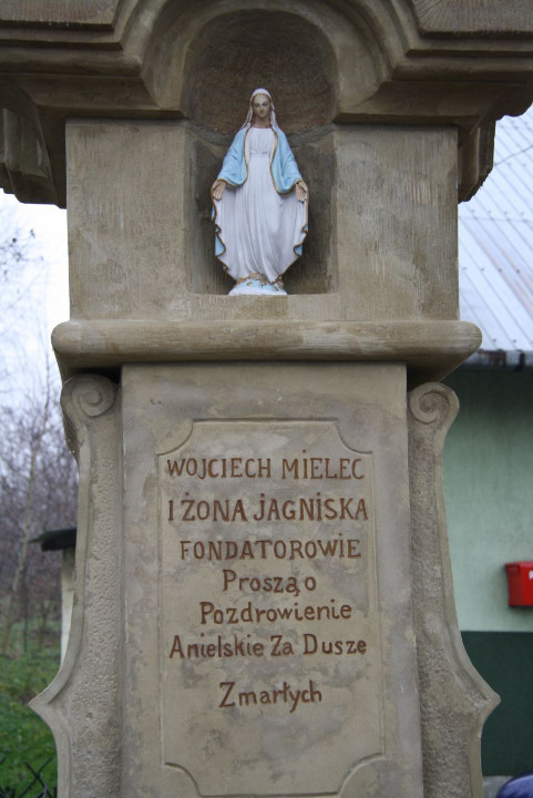 Datowana na rok 1873, krzyż wieńczący z 1930 r. Fundatorowie: Wojciech Mielec z żoną Jagniską. Forma wykonanej z piaskowca kapliczki odwołuje się do baroku. Składa się z postumentu zwieńczonego krzyżem, ustawionego na cokole i podwalinie. Podwalina w formie kwadratowej płyty. Cokół niski, prostopadłościenny. Na nim wyższy, prostopadłościenny, ujęty spływami wolutowymi postument, na którym płycina z napisem memoratywnym, wykutym drukowaną majuskułą: „WOJCIECH MIELEC // ŻONA JAGNISKA // FUNDATOROWIE // PROSZĄ O // POZDROWIENIE // ANIELSKIE ZA DUSZE // ZMARŁYCH”. Poniżej data: „1873 r.”. Spływy o kanelowanych powierzchniach. Postument nakryty profilowanym, gzymsowanym impostem z półokrągłymi obdasznicami. Na nakrywie krzyż z pasyjką ustawiony na profilowanej podstawie. Od frontu, na podstawie krzyża data: „1930”. Pole wokół figury wytycza wtórne ogrodzenie z giętych, spawanych prętów zbrojeniowych.