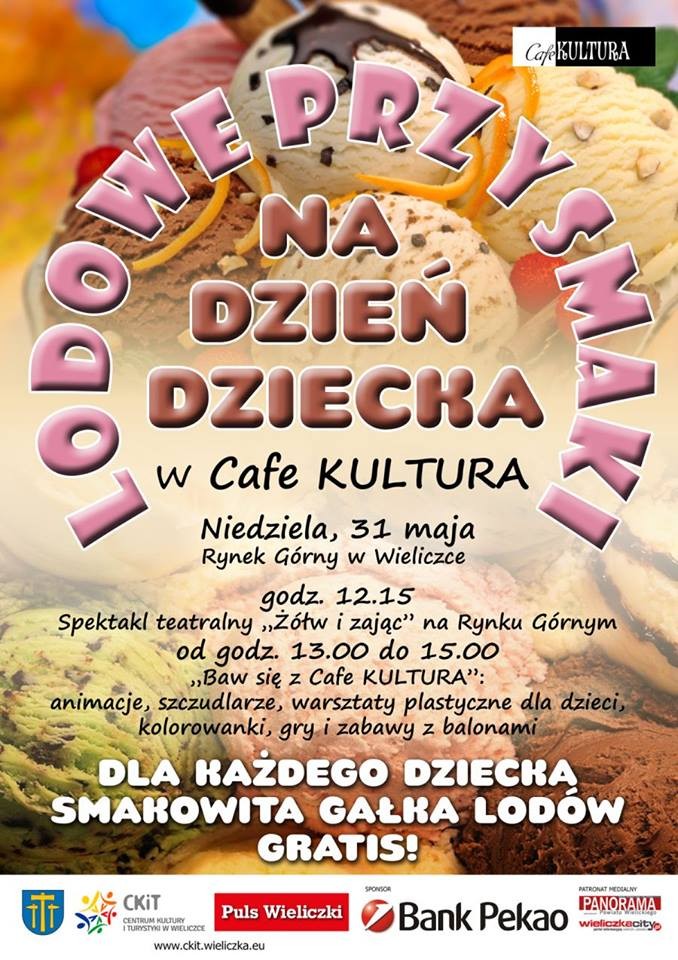 - 13.00-15.00 "Baw się z Cafe Kultura" - animacje, szczudlarze, warsztaty plastyczne dla dzieci, kolorowanki, gry i zabawy z balonami, dla każdego dziecka smakowita gałka lodów gratis.