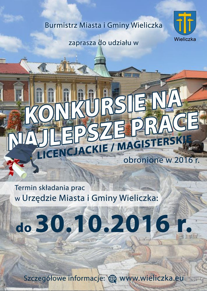 Prace licencjackie i magisterskie, obronione w 2016 r., należy przesyłać do 30 października 2016 roku na adres: Urząd Miasta i Gminy Wieliczka, ul. Powstania Warszawskiego 1, 32-020 Wieliczka.