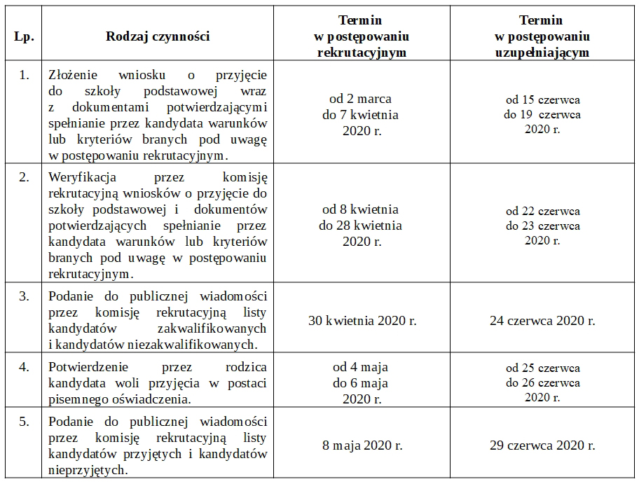 2) Terminy postępowania rekrutacyjnego i postępowania uzupełniającego do klas I publicznych szkół podstawowych: