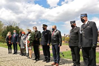 W imieniu straży pożarnej wiązankę kwiatów złożyli: komendant Powiatowy Państwowej Straży Pożarnej w Wieliczce mł. bryg. Leszek Kasiński, komendant Miejsko Gminny Związku OSP RP w Wieliczce Sebastian Szostak oraz prezes OSP Byszyce Janusz Chlebda.