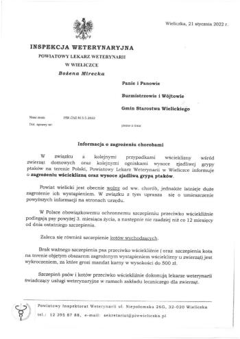W związku z kolejnymi przypadkami wścieklizny wśród zwierząt domowych oraz kolejnymi ogniskami wysoce zjadliwej grypy ptaków na terenie Polski, Powiatowy Lekarz Weterynarii w Wieliczce informuje o zagrożeniu wścieklizną oraz wysoce zjadliwą grypą ptaków.