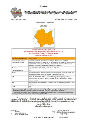 W godz. od 14:00 dnia 09.06.2022 do godz. 01:00 10.06.2022 prognozuje się burze, którym miejscami będą towarzyszyć bardzo silne opady deszczu od 30 mm, lokalnie do 50 mm oraz porywy wiatru do 75 km/h. Miejscami grad.