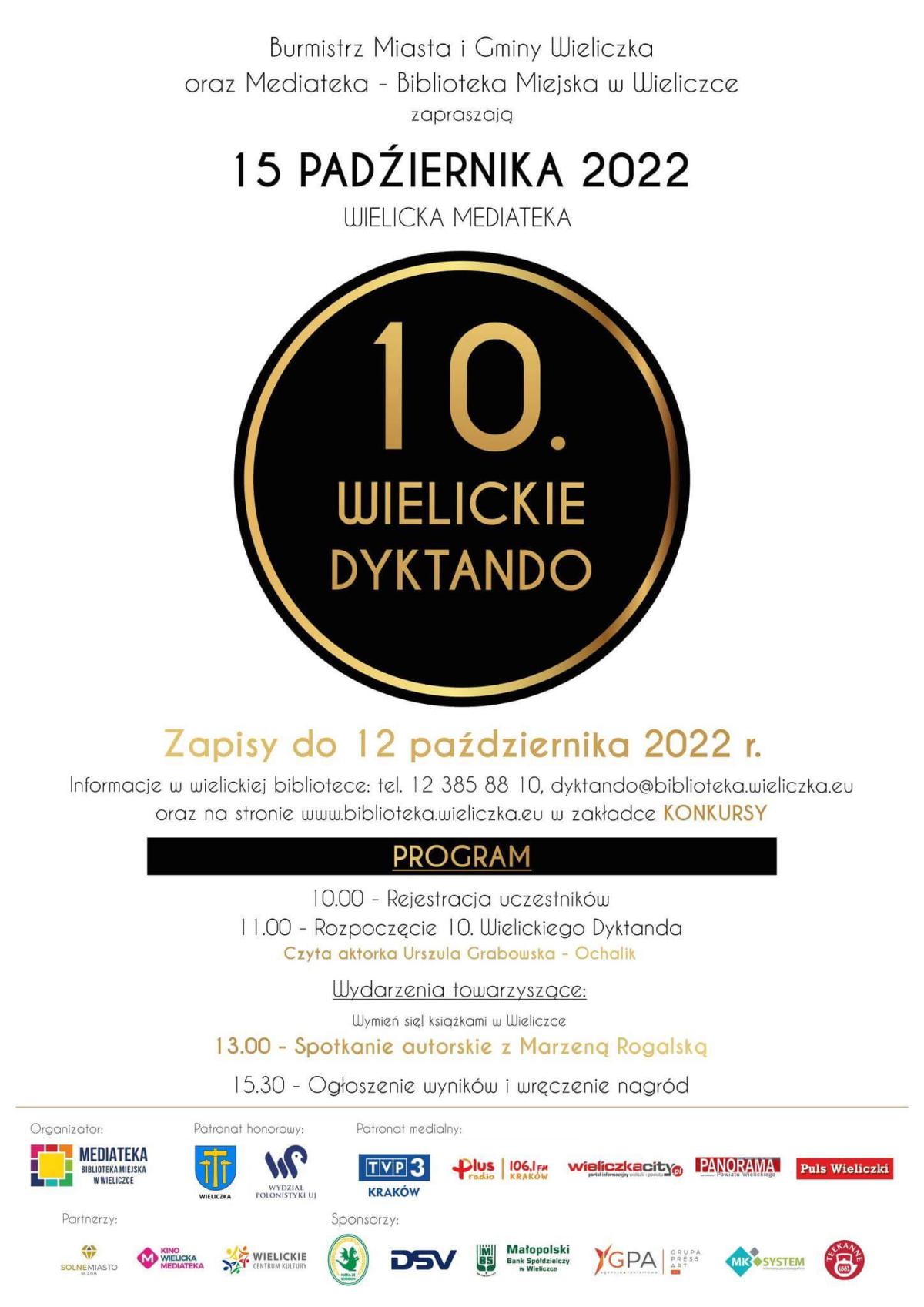 15 października 2022 roku o godz. 11:00, w sali kinowej Wielickiej Mediateki, rozpoczną się zmagania dziesiątej edycji lokalnego konkursu ortograficznego. Autorką tekstu najeżonego trudnościami będzie dr hab. Mirosława Mycawka. Tekst dyktanda odczyta aktorka Urszula Grabowska-Ochalik.