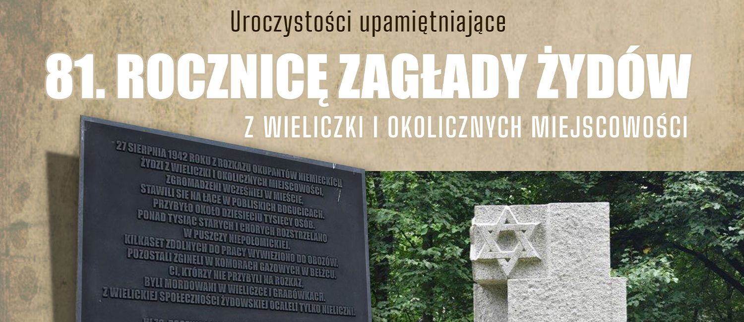 Artur Kozioł - Burmistrz Miasta i Gminy Wieliczka, Helena Jakubowicz - Przewodnicząca Gminy Wyznaniowej Żydowskiej w Krakowie zapraszają 27 sierpnia 2023 r. na uroczystości upamiętniające 81. ROCZNICĘ ZAGŁADY ŻYDÓW Z WIELICZKI I OKOLICZNYCH MIEJSCOWOŚCI