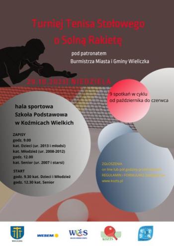 Zapraszamy na Turniej Tenisa Stołowego pod patronatem Burmistrza Miasta i Gminy Wieliczka, który odbędzie się w hali sportowej Szkoły Podstawowej w Koźmicach Wielkich. Cykl 9 spotkań rozgrywany będzie od października do czerwca 2023/2024 r.