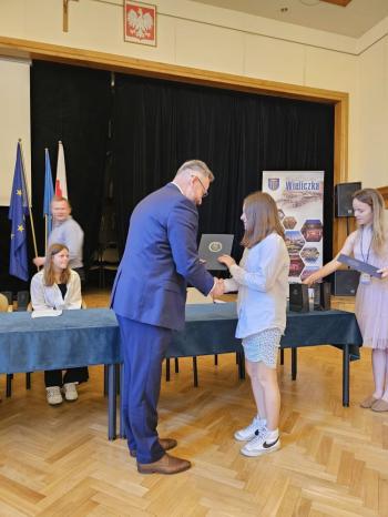 Następnie Zastępca Burmistrza Lucjan Rówiński podziękował radnym, którzy ukończyli VIII klasę, za ich współpracę, wręczając im upominki i składając serdeczne życzenia dalszych sukcesów edukacyjnych.