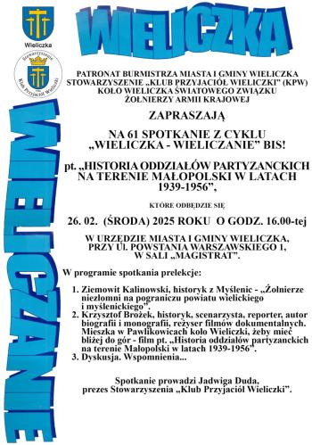 Stowarzyszenie „Klub Przyjaciół Wieliczki” (KPW), zaprasza 26. 02. (środa) 2025 r. na godz.16.00-tą do Wieliczki do sali „Magistrat” w Urzędzie Miasta i Gminy przy ul. Powstania Warszawskiego 1 na 61 spotkanie z cyklu „Wieliczka-Wieliczanie” Bis! pt. „Historia oddziałów partyzanckich na terenie Małopolski w latach 1939-1956”.