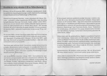 W folderze mec. Cezarego Brożka czytamy: Rozbicie więzienia UB w Miechowie. W nocy z 24 na 25 kwietnia 1945 r. żołnierze z poakowskich struktur podziemia niepodległościowego rozbili więzienie Powiatowego Urzędu Bezpieczeństwa Publicznego w Miechowie. Obwód Armii Krajowej Miechów – wraz z obwodami AK Olkusz i Pińczów – wchodził w skład Inspektoratu AK Miechów. Jego dowódcą był ppłk Bolesław Nieczuja-Ostrowski „Tysiąc”, „Bolko”. Latem 1944 r. utworzono na tym terenie dwie wielkie jednostki bojowe przeznaczone do walk powstańczych w ramach akcji „Burza”: 106. Dywizję Piechoty AK oraz Krakowską Brygadę Kawalerii Zmotoryzowanej. W styczniu 1945 r. jednostki Inspektoratu liczyły ponad 15 tys. żołnierzy. 16 stycznia 1945 r. Armia Czerwona zajęła Miechów. Armia Krajowa została formalnie rozwiązana aby chronić żołnierzy przed sowieckimi represjami.
