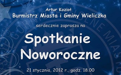 Burmistrz Miasta i Gminy Wieliczka Artur Kozioł serdecznie zaprasza na Spotkanie Noworoczne, które odbędzie się 21 stycznia 2012 r. o godz. 18.00 w Centrum Edukacyjno-Rekreacyjnym "Solne Miasto" w Wieliczce. Wśród wzajemnych, noworocznych życzeń uczestnicy spotkania będą mieli okazję wysłuchać koncertu kolęd w wykonaniu chórów i zespołów z Wieliczki, obejrzeć koncert Renaty Przemyk oraz występ Orkiestry Dętej z Podstolic, a także uczestniczyć we wspaniałej zabawie karnawałowej z zespołem SOKÓŁ ORKESTAR.